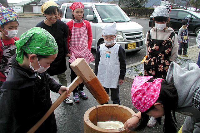 【内容】 臼と杵を用いて餅つきを行いました。参加者は、餅つきの様子を珍しそうに見ながら順番に餅つきを行い楽しんでいました。最後は自分たちでついたお餅をみんなで分け合い、美味しくいただきました。 【講師・サポーター】 地域住民 |