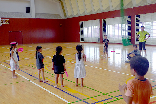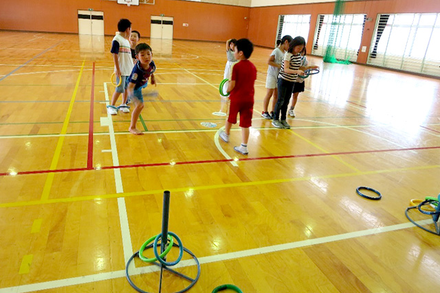 【内容】 ルールがシンプルで低学年でも出来る輪投げを実施。 個人戦と男女対抗の団体戦を行い、チームメイトに大きな声援を送ったり,上級生が下級生に投げ方を指導するといったことも見られ,大盛り上がりでした。 【講師・サポーター】 センター職員 |