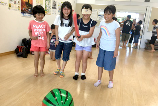 【内容】 スポンジの剣とスイカ柄のビーチボールを用いてスイカ割りを行いました。 |