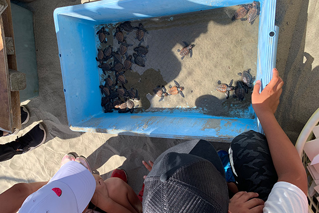 【内容】 国際的な絶滅危惧種である、アカウミガメの孵化場を見学!孵化したばかりのカメを見て、参加者は自然と「元気に大きくなってね。」と口々に言い、とても微笑ましい表情でした。 【講師・サポーター】 御前崎市ウミガメ産卵観察会 |