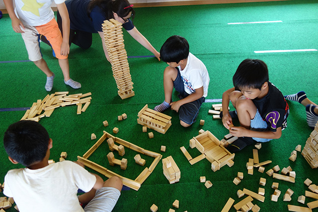【内容】 伐採によって生じた木材の積み木を使って、自由に遊びました。森林の管理の大切さを伝える紙芝居も行いました。 【講師・サポーター】 公営財団法人オイスカ |