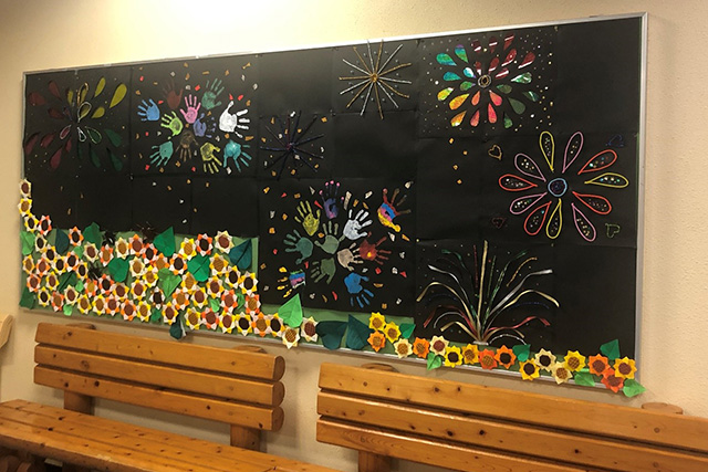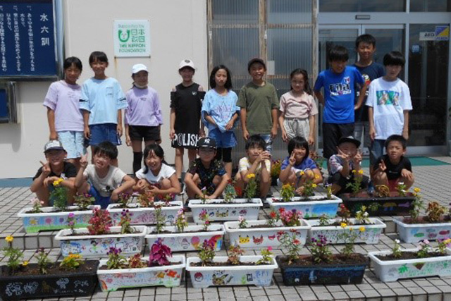 【内容】 プランターにクレヨン等でイラストを描き、花植えを行いました。センター入口に飾ったところ、来場者から感動の声あり。写真撮影をする人も! |