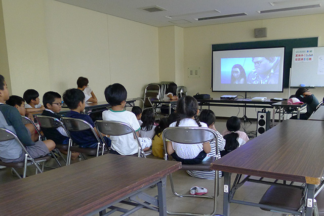 【内容】 DVDをプロジェクターに投影し、家族の絆や友情、勇気などを題材にした子ども向け映画の鑑賞を行いました。 |