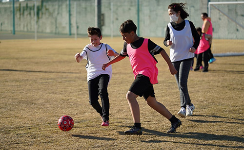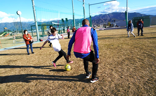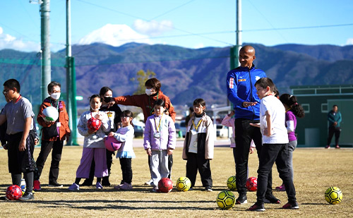 そんな思いが天に届いたのか、連日雨が続いたのが嘘のように、この日は晴天。青空には南アルプスの山々がくっきりと浮かびあがり、富士山もひょっこりと顔を出していた。雄大な自然に囲まれた広場に、長身のヘナト選手が登場すると、子どもたちはキラキラと瞳を輝かせ、とても興奮しているように見えた。その興奮を抑えきれず、ヘナト選手へ駆け寄りうれしそうに声を掛ける子どもの姿も。この日の参加者は合計13 名。小学校の低学年から高学年まで、年齢も性別も関係なく全員でボールを追う。
