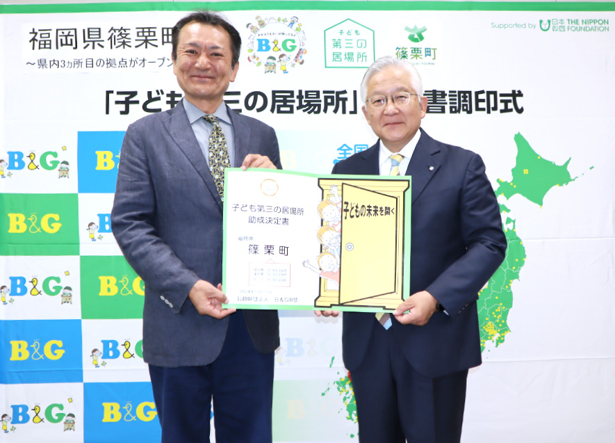 | 式次第 | 【決定書授与式・協定書調印式】 一、開会 一、B&G財団 理事長 挨拶 一、決定書授与 一、協定書調印 一、篠栗町 町長 挨拶 一、写真撮影 一、「子ども第三の居場所」概要説明 一、質疑応答 |