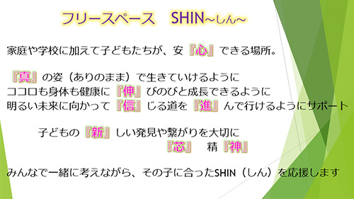子ども第三の居場所 篠栗拠点は、「フリースペースSHIN」という名前で2024年4月に開所した。このSHINには、家庭や学校に加えて子どもたちが安「心」できる場所、という以外にも色々な「SHIN」の意味が込められており、今後は子どもたちそれぞれにあった「SHIN」を応援していく予定である。