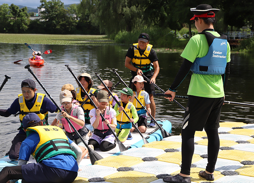 『海の航海』ではビックサップやカヌーに初挑戦の子どもたちが多く、ドキドキした様子で乗船した。ビックサップではみんなで息を合わせて、カヌーは一生懸命パドルを漕ぎながら水上に浮かぶキーワードを探した。