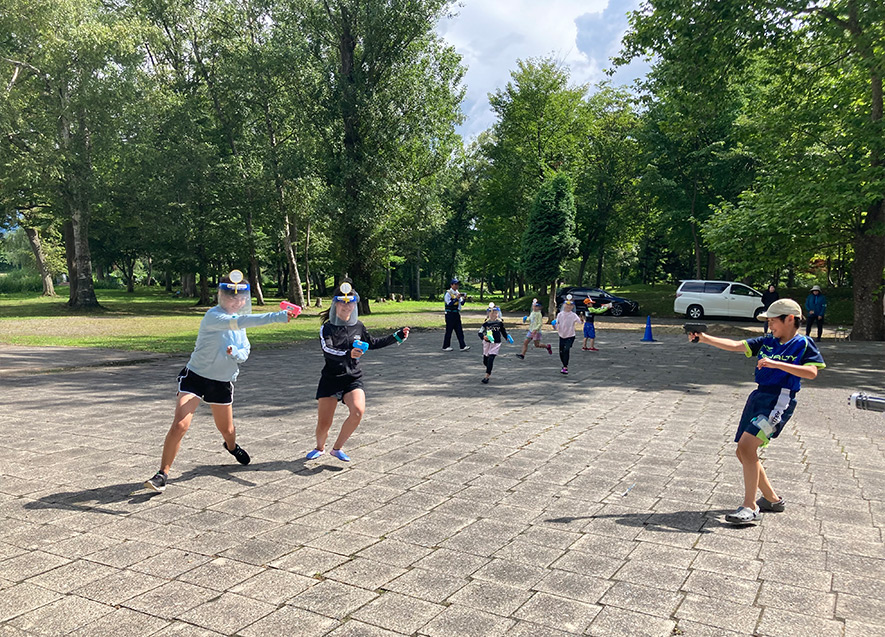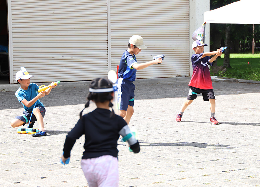 頭上につけたポイが濡れて破けてしまうと脱落というルールで、水鉄砲攻撃を避けながら相手チームの陣地に攻め込み、先に相手チームのタイマーを止めた方が勝ちとなる。