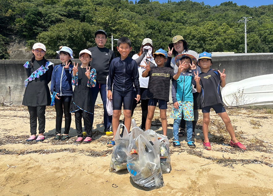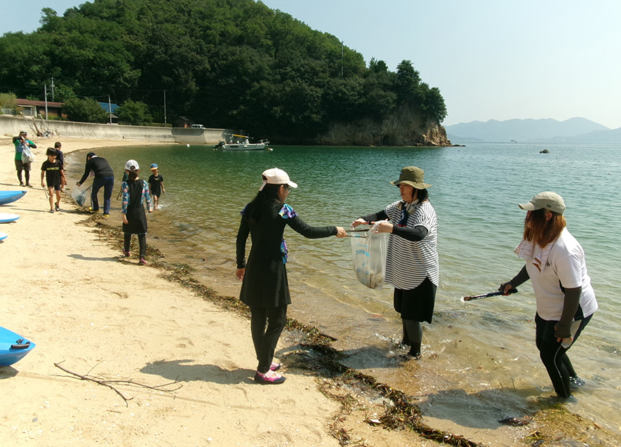 海洋センターに到着して、着替えを済ませると、海岸のごみ拾いからスタート。みんなで協力して色々な種類のごみを回収した。子どもたちは「きれいに見える砂浜も、よく見るとたくさんごみが落ちている」などと話し合いながら、積極的にごみ拾いを行い、環境美化に努めた。