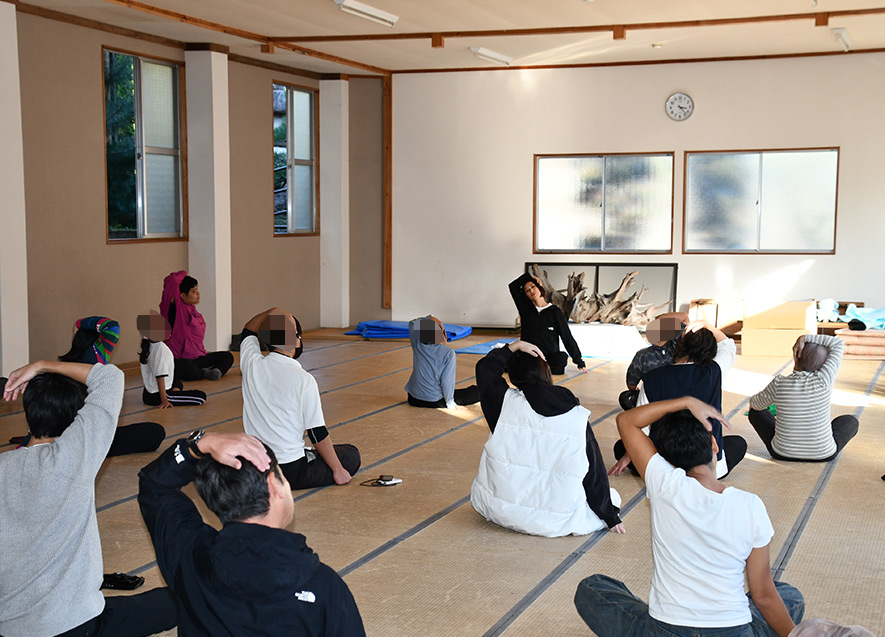 キャンプにあたり、子どもたちが酒井氏と一緒にやりたいことを話し合い、その1つが「ヨガ体験」だった。
