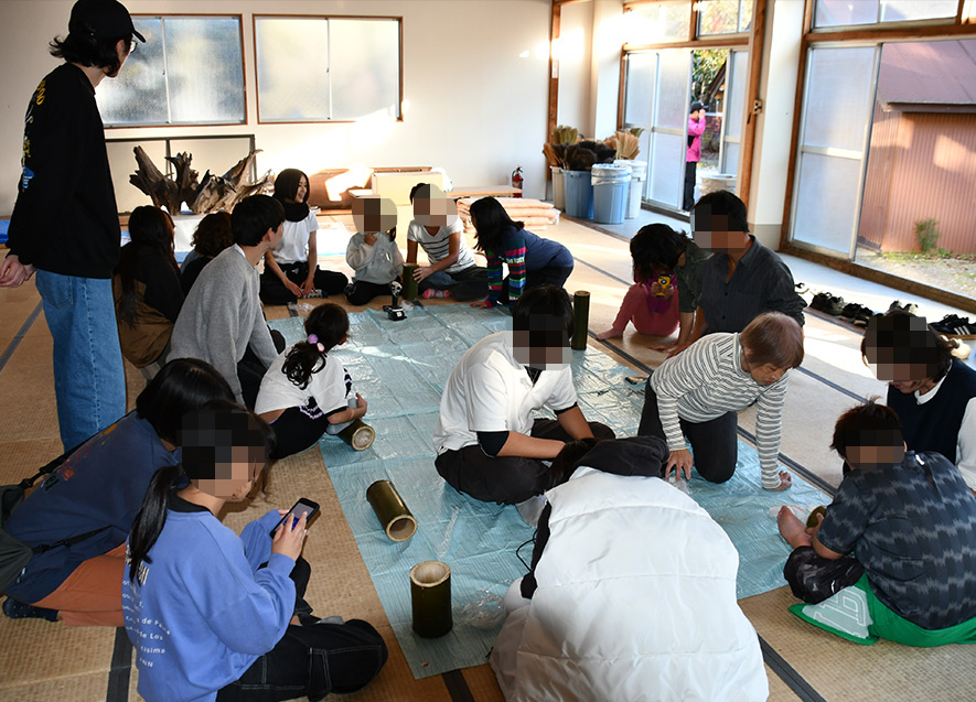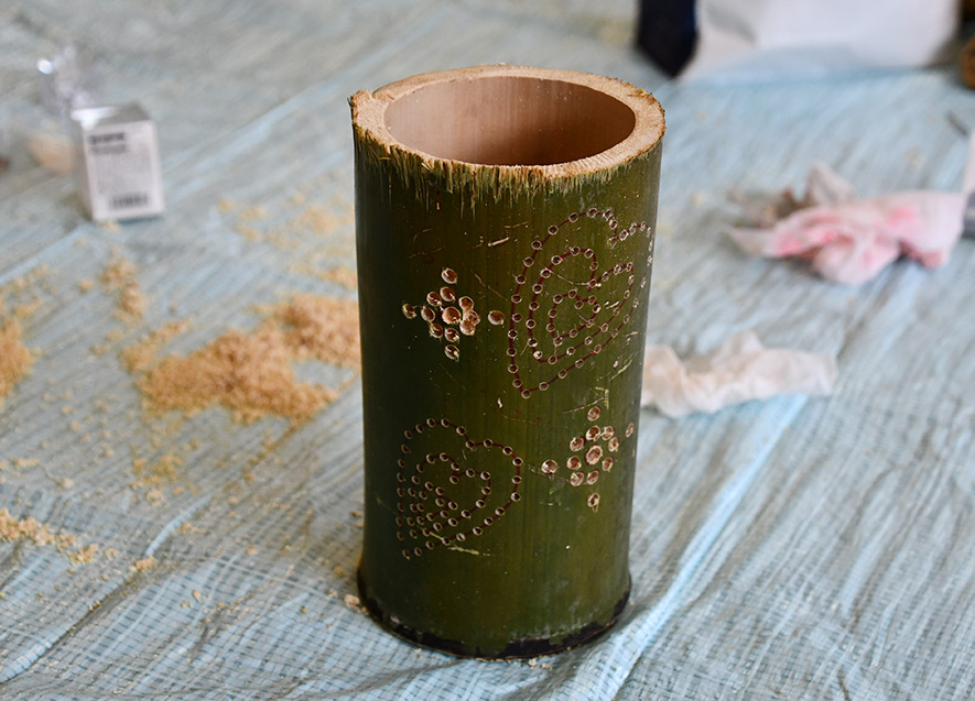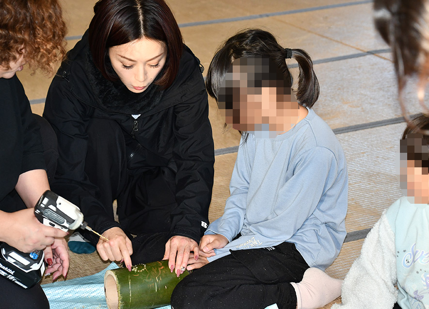 子どもたちが2つ目のレクリエーションに選んだものは、灯篭作り。竹に思い思いのデザインを描き、それをもとに電動ドリルを使って穴をあけていく。子どもたちが怪我無く灯篭を完成させられるよう、酒井氏もサポートを行った。