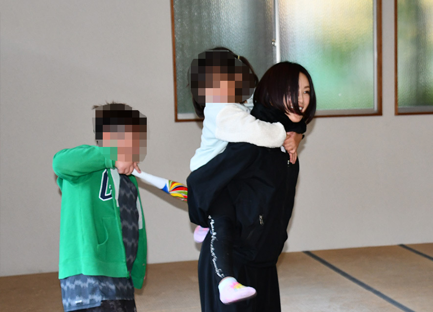 灯篭づくりを終えると、子どもたちは酒井氏とボール遊びや腕相撲、追いかけっこ等をして楽しんだ。小さな子どもからおんぶをねだられ、酒井氏が笑顔で対応すると、子どもは大喜びしていた。
