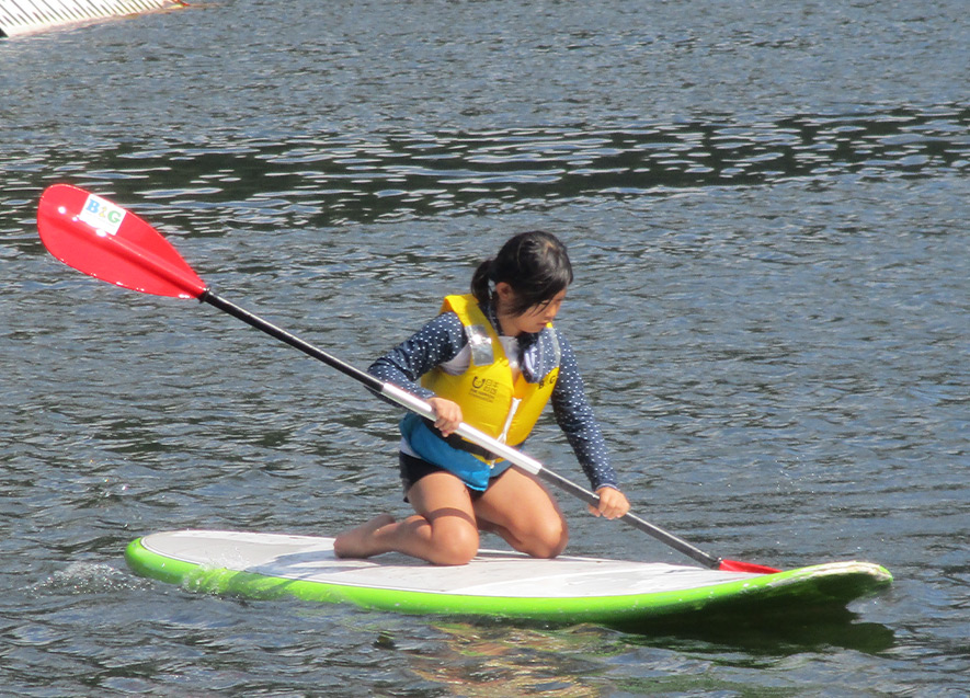 準備体操を行い、ライフジャケットの着用方法を学んでから、いざSUPとカヌーに挑戦!