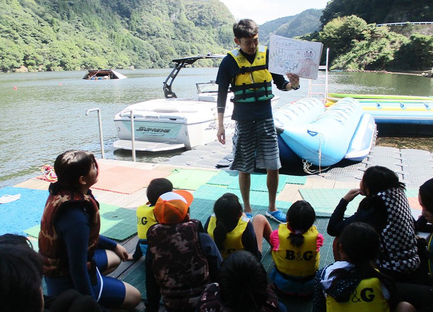 あわせて、水辺の安全教室を行い、落水時の対処法や危険箇所など、安全に楽しく水辺で活動するための要点についても学んだ。