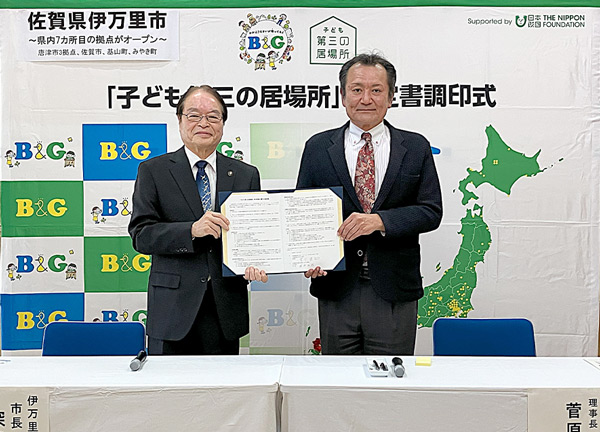 | 式次第 | 【協定書調印式】 一、開会のあいさつ 一、挨拶 B&G財団 理事長 菅原 悟志 一、挨拶 伊万里市長 深浦 弘信 一、協定書調印 一、写真撮影 一、「子ども第三の居場所」伊万里拠点概要説明 (こども家庭センター長 松尾 利矢氏) 一、報道機関取材・質疑応答 【終了後】 施設内覧会 |