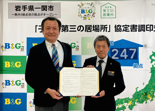 | 式次第 | 【協定書調印式】 一、開会のあいさつ 一、挨拶 B&G財団 理事長 菅原 悟志 一、挨拶 一関市長 佐藤 善仁 一、協定書調印 一、写真撮影 一、「子ども第三の居場所」一関拠点概要説明 (一関市 子ども家庭課 及川氏) 一、報道機関取材・質疑応答 【終了後】 施設内覧会 |