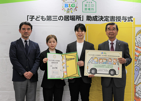 | 式次第 | 決定書授与式 一、開会のあいさつ 一、挨拶 B&G財団 常務理事 朝日田 智昭 一、助成決定書 授与(開設費・車両費) 一、写真撮影 一、挨拶 白子町長 石井 和芳 一、「子ども第三の居場所」白子拠点概要説明 一、報道機関取材・質疑応答 一、閉式 |