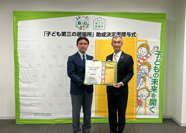| 式次第 | 一、開会のあいさつ 一、挨拶 B&G財団 常務理事 朝日田 智昭 一、助成決定書 授与 一、写真撮影 一、挨拶 宮津市長 城﨑 雅文 一、「子ども第三の居場所」宮津拠点概要説明 一、報道機関取材・質疑応答 一、閉式 |