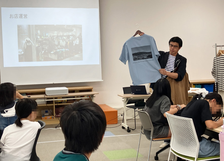 午前中は、美咲町の有限会社丸美屋の黒瀬社長が、洋服の製作から販売までの流れや地元アパレル業の仕事について講話を行った。