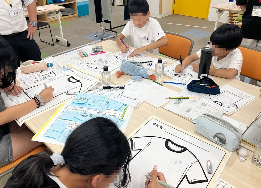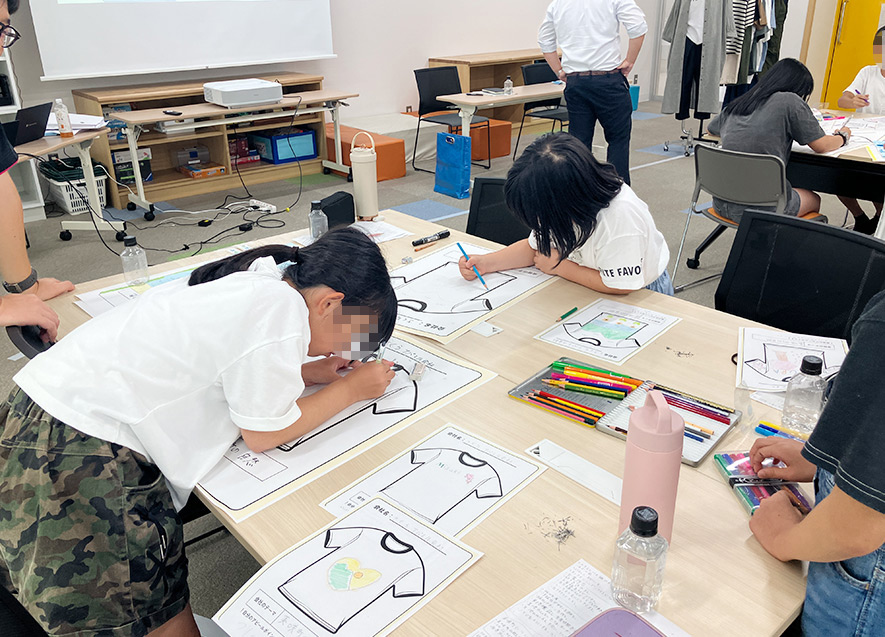 午前中に学んだアパレル事業や、美咲町の農業・観光資源に関する講話を踏まえ、子どもたちにはアパレル会社を立ち上げてもらい、自社の看板商品となるTシャツのデザイン作成に取り組んだ。