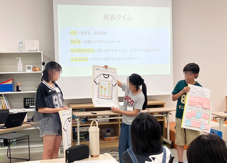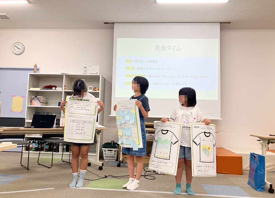 ワークショップの締めくくりとして、子どもたちが設立した会社ごとに、デザインのテーマや内容、アピールポイントなどを発表した。