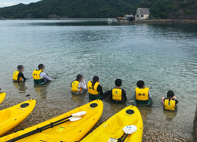 そしていよいよ、楽しみにしていた海レク体験。4班に分かれて、カヌー、バナナボート、BIG SUP、生物観察を体験した。