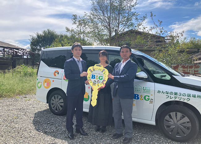 | 式次第 | 一、開会のあいさつ 一、挨拶(高森町長 草村 大成 氏) 一、挨拶(B&G財団常務理事 朝日田 智昭) 一、送迎車両活用計画 説明 一、報道機関取材・質疑応答 一、送迎車お披露目・記念撮影 一、閉式 |
