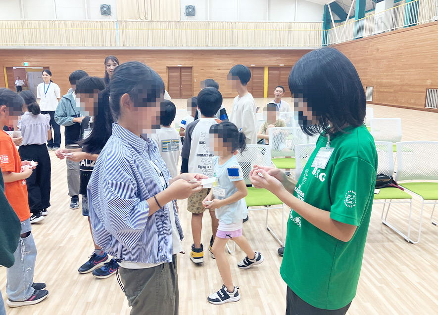 はじめに、アイスブレイクとして「じゃんけんチャンピオン」と「じゃんけん列車」を実施。開始当初は緊張や不安の表情を見せる子どももいたが、ゲームが進むにつれて笑顔や笑い声が広がっていった。特に「じゃんけん列車」では、肩をつなぎ合いながら楽しむ姿が印象的で、自然な会話が生まれ、会場の雰囲気が和やかになった。短い時間の中でも、子どもたちの距離が縮まり、活動の良いスタートとなった。