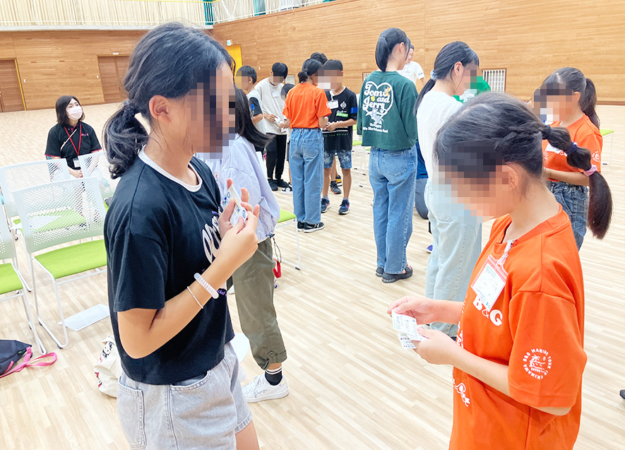 「バースデイライン」では、声を出さずに誕生日順に並ぶというルールのもと、身振り手振りを駆使しながら互いに意思を伝え合い、協力して列を完成させた。最初にレクリエーションを実施した時よりも自然と笑顔になり、互いに助け合う場面が多く見られた。