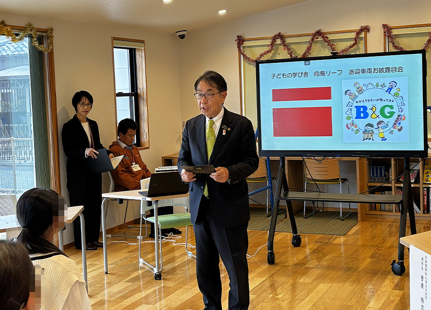 | 式次第 | 一、主催者あいさつ(尾道市 市長 平谷 祐宏 氏) 一、来賓祝辞(B&G財団 理事長 菅原 悟志) 一、拠点運営状況及び送迎車両の活用計画 (向島拠点 北森マネージャー) 一、子どもたちからお礼のことば 一、送迎車お披露目・記念撮影 ※式典後、クリスマス会を実施 |
