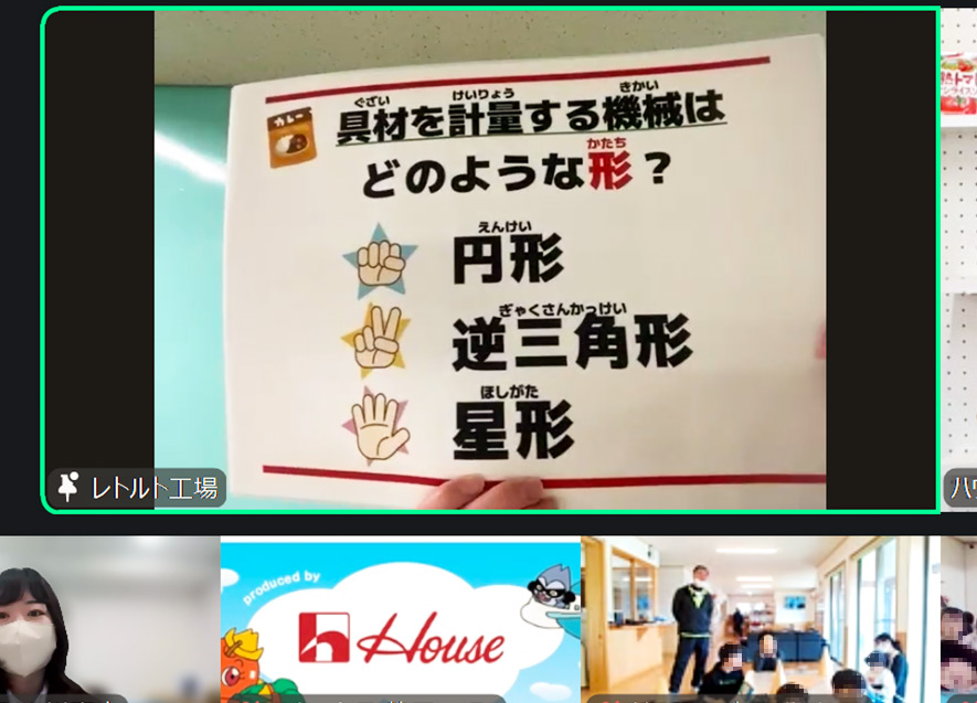 今年度最後である4回目のすまいるスタジオは、前回好評だった学習系プログラム(リモート自動車工場見学)の第2弾として、レトルトカレーがどのようにして出来上がっていくのか、どんな工夫があるのかを子どもたちに学んでもらった。