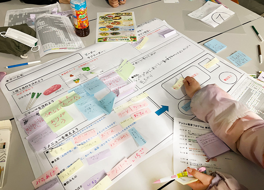 午後からは、創出体験ワークショップ「横芝光町の食材を使って給食のメニューを考えよう」を実施。午前中の講話内容を踏まえ、子どもたちは給食プロジェクトチームを結成し、町内産の農産物を活用した給食メニューの企画に取り組んだ。