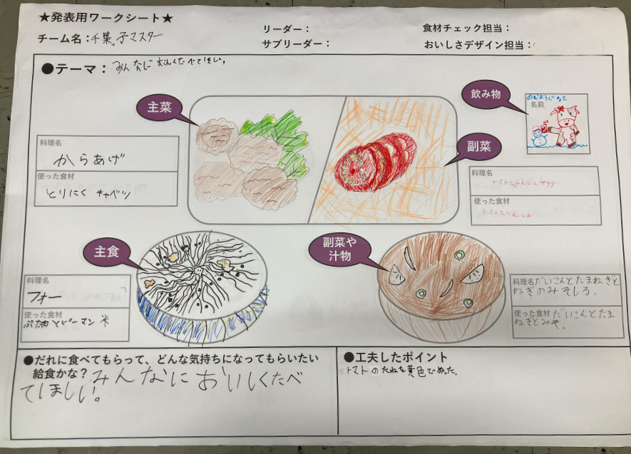 プログラムの最後には、各チームが考案した給食メニューを発表し、設定したテーマや工夫した点について紹介した。