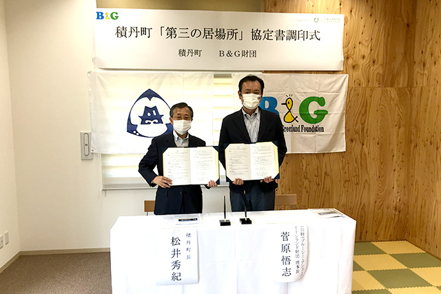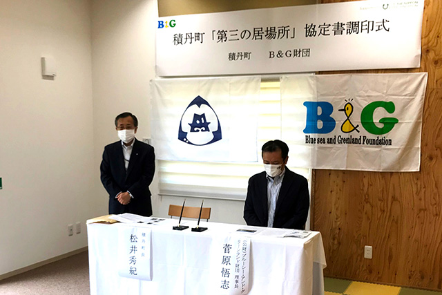 調印式にあたり、積丹町の松井秀紀 町長は「積丹町内に魅力的な施設を建設させていただいた。積丹町の特色を活かしながら、地域の子供たちのために有効活用していきたい」と今後の方向性について話されました。続いてB&G財団の菅原悟志理事長は「積丹町の皆さまのご尽力で子供たちが健やかに育つ環境を整えていただきたい」とあいさつしました。