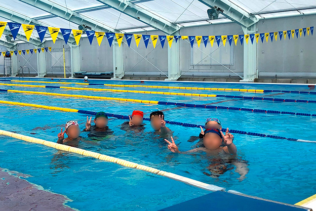 体力向上プログラムは、運動習慣を身につけることを目的に、隣接の海洋センターで指導員による運動プログラムが行われています。7月からは毎週水曜日を「水の日」として、プールで水泳教室を実施しています。
