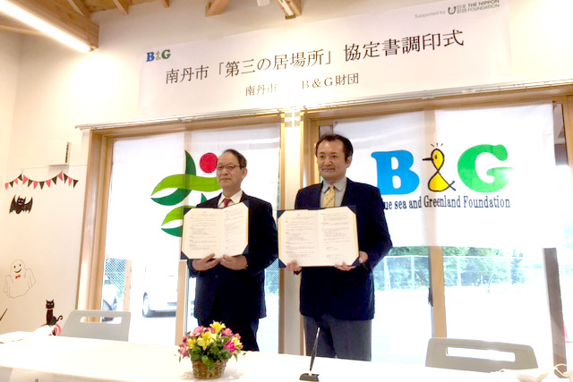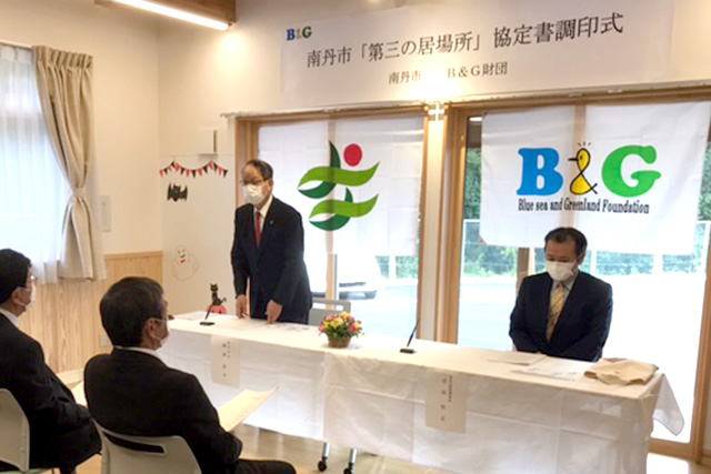調印式にあたり、南丹市の西村良平市長は「地域の様々な方に携わってもらいながら子どもたちを支援していく場としていきたい」と今後の方向性について話されました。続いてB&G財団の菅原悟志理事長は「子どもたちや高齢者等が集う多世代交流の場とするなど、施設を有効活用していただきながら、健やかな子どもたちを育てていってほしい」とあいさつしました。