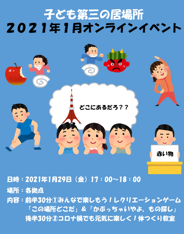 2021年1月29日(金)、子ども第三の居場所の拠点を対象とした「1月 オンラインイベント」を開催。笠間(茨城)・大町(長野)・燕(新潟)・杵築(大分)の4ヵ所の拠点から児童52人が参加しました。