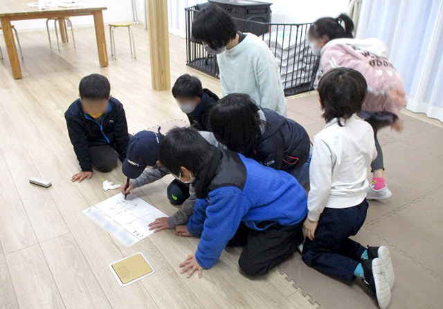 【②かぶっちゃいやよ、もの探し】では、制限時間内に、財団職員が提示したお題に該当する物を施設内から探し出し、回答しました。参加者は、該当する物を見つけようと一目散に駆け出しました。「やわらかいもの」というお題に対して、『とうふ』『メラニンスポンジ』『ぬいぐるみ』『スクイーズ(低反発の粘土のようなおもちゃ)』と回答はさまざま!子どもたちの自由な発想力に驚かされました。