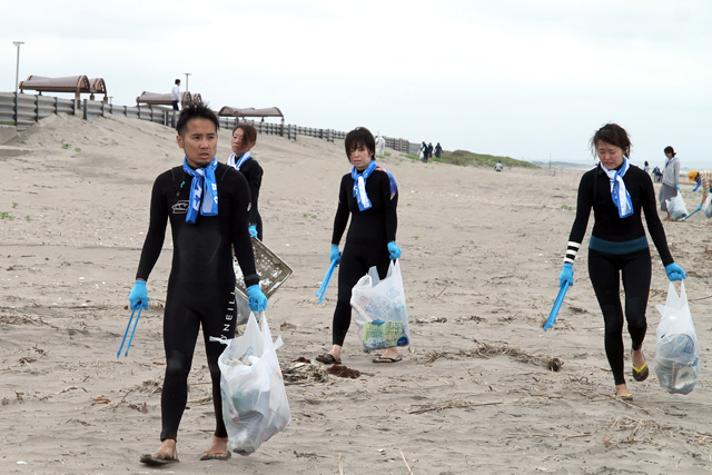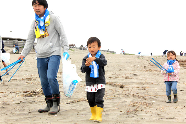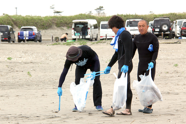 当日は、横芝光町佐藤晴彦町長をはじめ、海洋クラブ員や横芝敬愛高校の生徒、サーファーと一緒に、子ども健全育成大使の酒井法子さんも海浜の清掃活動に参加。約130名の方々が、屋形海岸の海浜清掃を行い、海岸に打ち上げられたたくさんのゴミを拾いました。