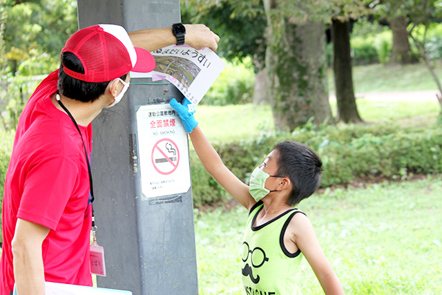 白岡市海洋センターでは、子ども達に楽しく海ごみ問題を学んでもらうため、ごみ問題や地域にまつわるクイズを出題し、ルート上に設置したヒントから答えを探すクイズラリー形式の清掃活動を行いました。