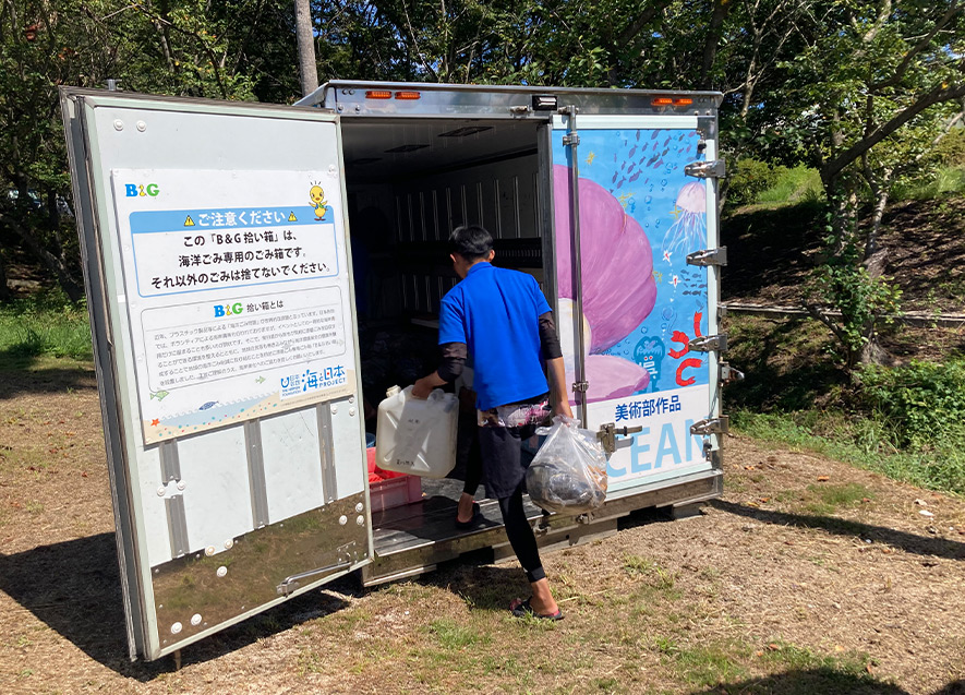 艇庫に戻った後、回収した海ごみは「B&G拾い箱」に運び込んだ。呉市蒲刈B&G海洋センターの拾い箱は、艇庫に隣接して二つ設置されており、一つは小さな海洋ごみの保管場所として、もう一つは大型の漂着ゴミの回収場所として活用されている。