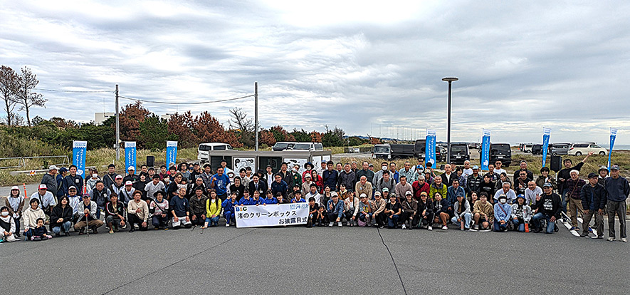 静岡県で初となる、漂着ごみ専用ごみ箱「B&G拾い箱」のお披露目式を11月3日、磐田市の渚の交流館で実施。式典に合わせて、豊浜海岸のクリーン活動が行われ、当日は豊浜地域づくり協議会や中部電力パワーグリット㈱磐田営業所、ヤマハ発動機労働組合磐田北支部など、地元企業やボランティアなど約150人が参加した。