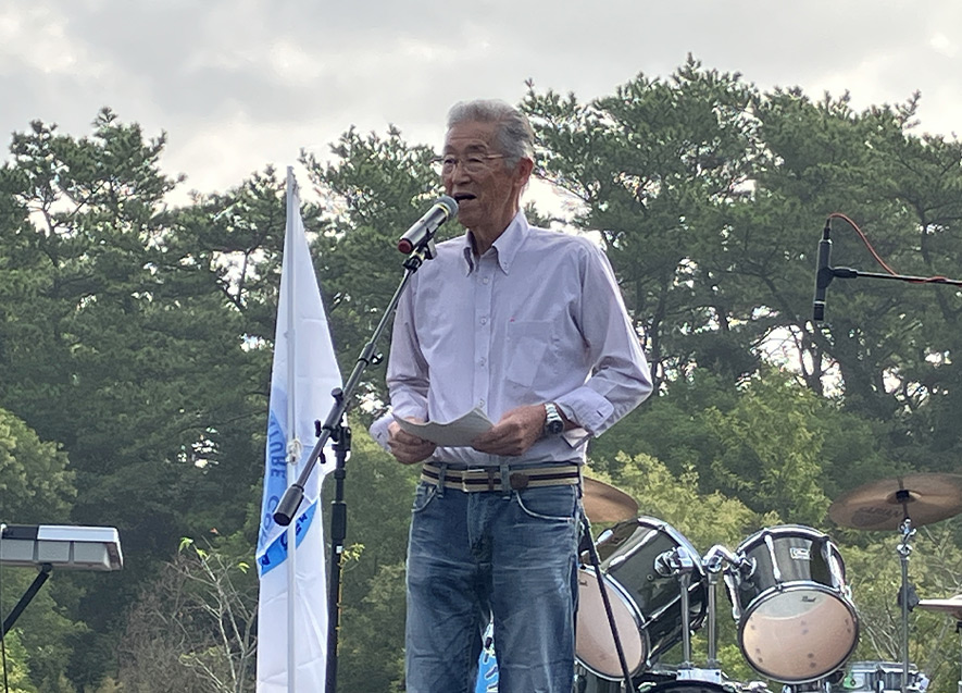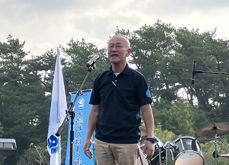 続いて、海洋クラブ代表の新宮氏は、拾い箱のイラストを描いてくれた児童に感謝を述べた後、「こうした海岸清掃イベントを通じて、郷土愛を育んでほしい」を語った。