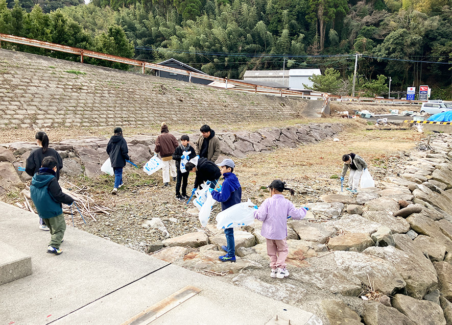 冬の寒さを吹き飛ばすほど、子どもたちは元気にゴミ拾いに参加していた。一見きれいに見える艇庫周辺も、ポリ袋やペットボトル、大型の漁業ゴミなどが多数あり、短時間で多くのゴミが集まった。