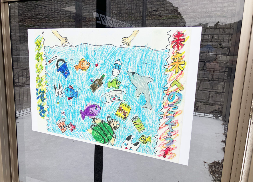 拾い箱の前面には、昨年、海ごみセミナーの活動において児童が作成した絵と、お披露目式において地元児童・生徒により描かれた絵を掲示している。