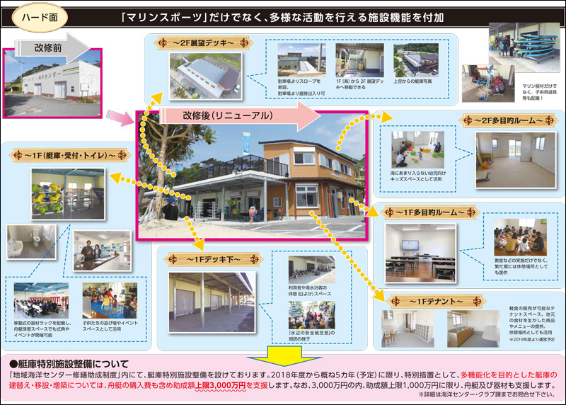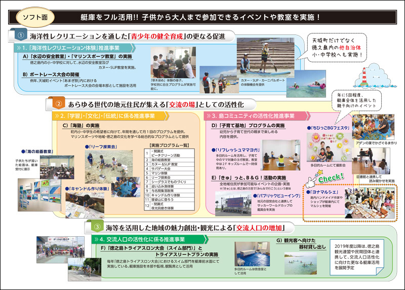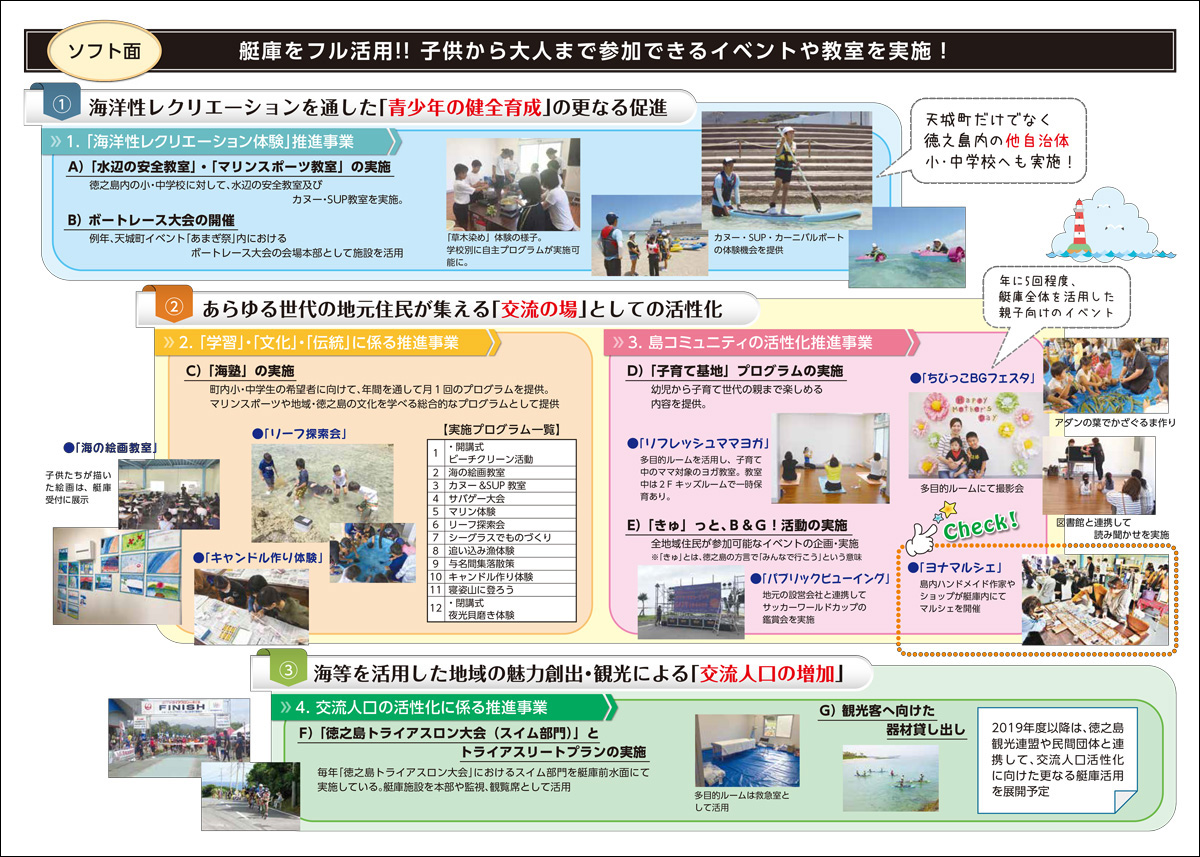 奄美群島の中央に位置する徳之島にある天城町B&G海洋センターでは、艇庫の改修による交流人口の増加という切り口から次世代艇庫のモデルとして艇庫を改修し、交流人口増加、地元住民の交流の場として事業に取り組みました。