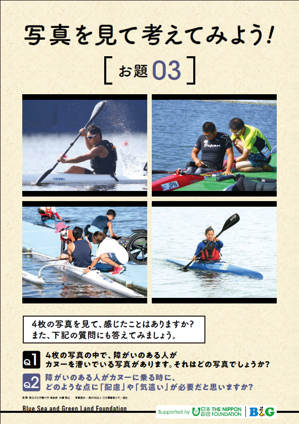 参加者A:まず、車いすからカヌーに乗る時に、障害のある人が安全にカヌーに移動することが大切だと思います。それから、介助する人も無言でサポートしていたら、カヌーに乗る人も怖いと思います。