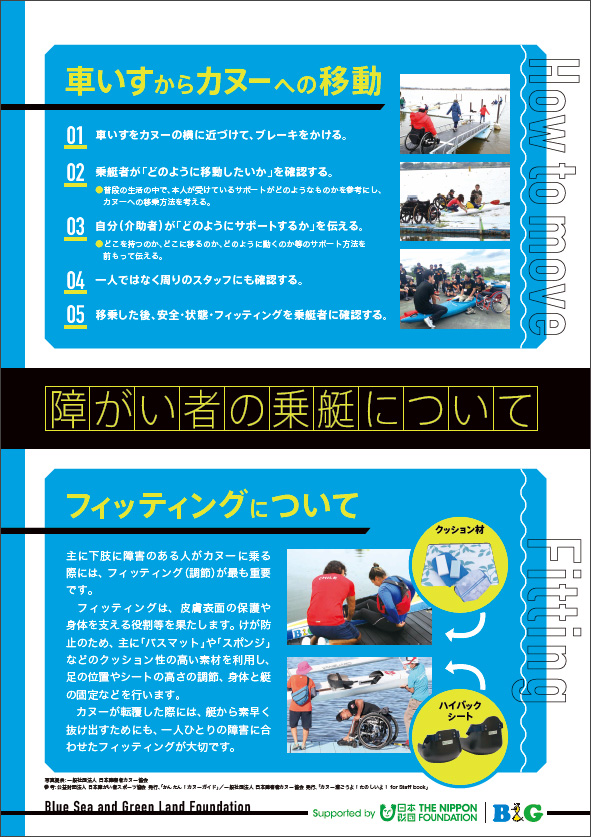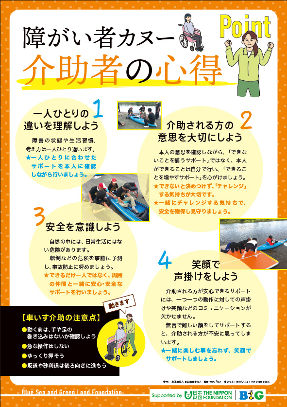 障がい者の方でもカヌーを楽しめるよう、また、介助者側も安心してサポートできるよう、心得や配慮する点などを紹介