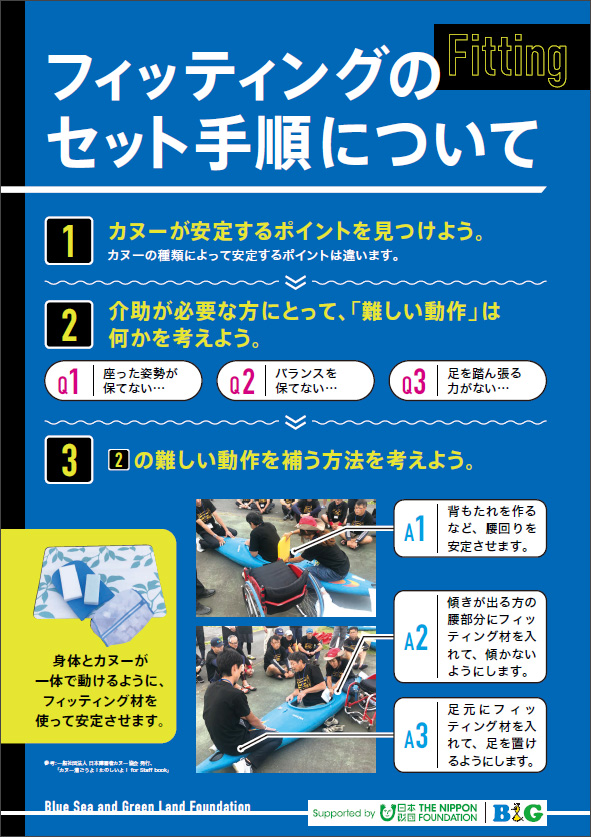車いすの障がい者がカヌーを体験する際、コックピットへの移動とフィッティング(身体と艇を固定するための作業)について紹介