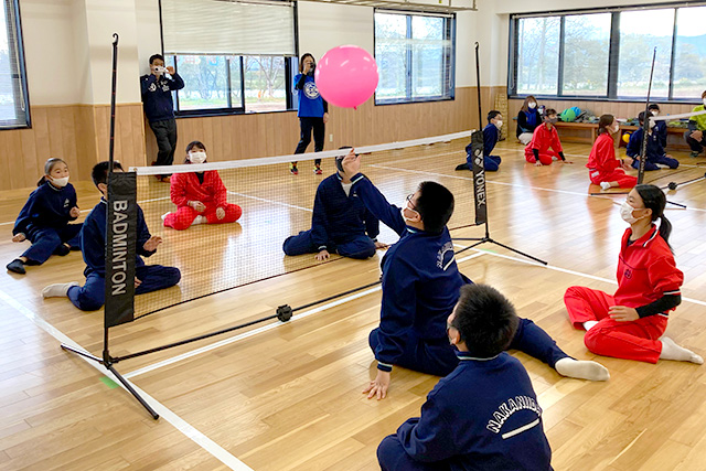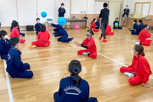 シッティングバレー体験では、まず、ゲーム形式で基本動作の練習。続いて4つのグループに分かれてラリー練習を行い、風船やソフトバレーボール、実際に使用するバレーボールなど、ボールの違いを確かめながら練習しました。